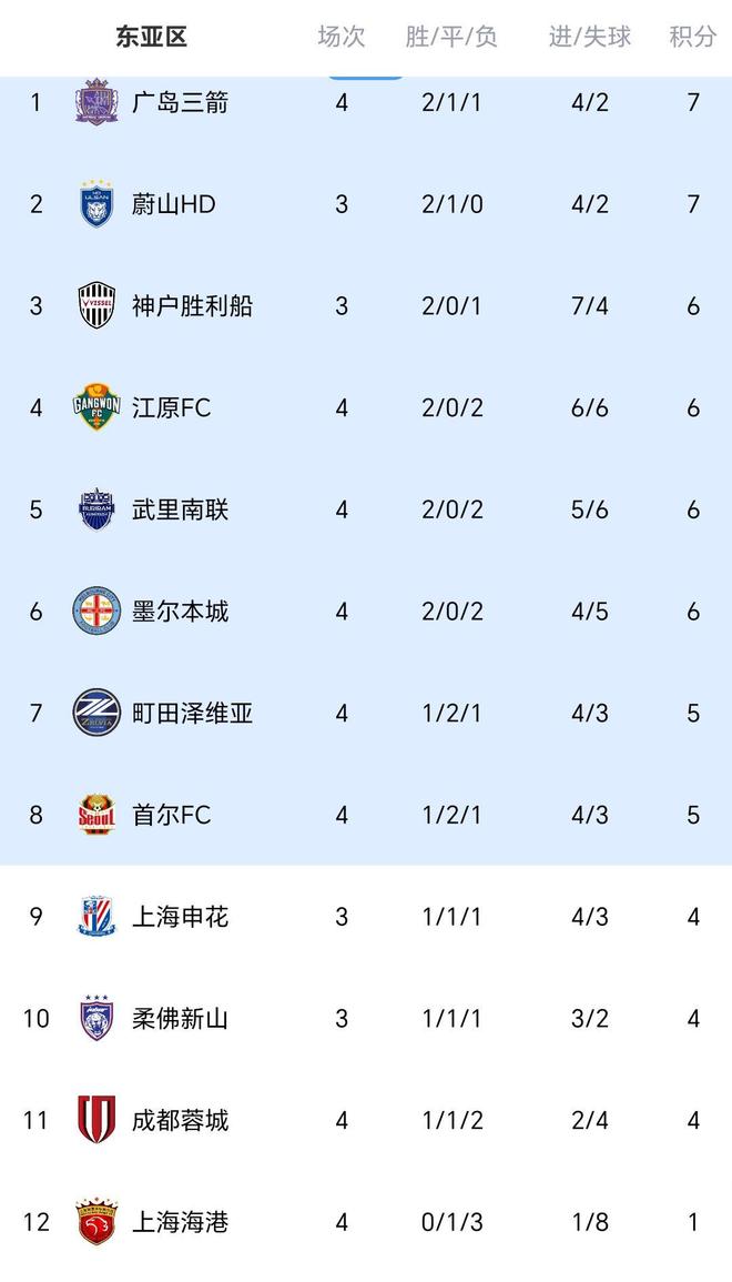 以下是亚冠东亚区的最新积分榜排名,上海海港继续垫底,成都蓉城跌至倒数第二: